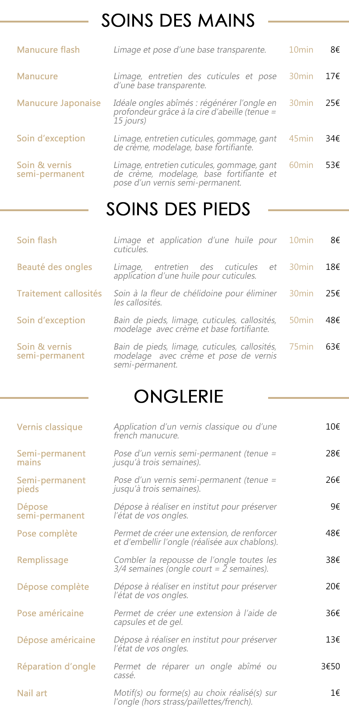 Belle jusqu'aux bouts des ongles ! Découvrez nos différentes manucures, les extensions d'ongles en gel ainsi que la pose de vernis semi-permanent pour les mains ou pour les pieds et offrez-vous 3 semaines de tranquillité.